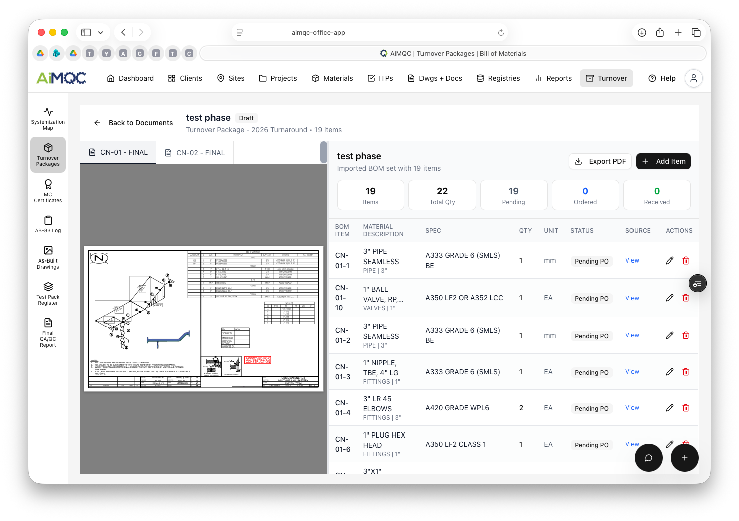 - AiMQC builds the turnover package as work progresses and tracks project completion to ensure integrity and fully verified deliverables.